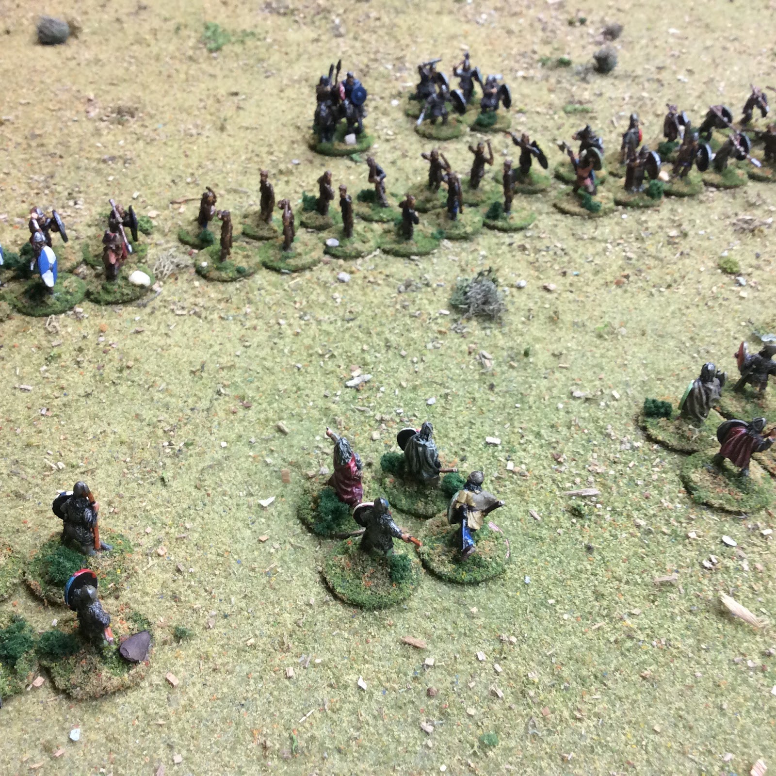 As the battle raged, the Vikings took a rising toll of casualties. The Anglo-Saxons took their share of casualties as well, but their units were larger and could absorb them better. As Olaf made the decision to fall back, consolidate, and plan his next move, Wolfred went on the offensive in a counterattack. The Anglo-Saxon hearthguard charged the depleted Viking warriors on Wolfred's left flank, throwing the exhausted Vikings back. Across the line, the Anglo-Saxons moved forward to attack (with the exception of the feeble archers, who only had 2 figures left). Wolfred threw himself into the fight as well, charging the isolated Viking unit that had charged the archers. The Vikings fought to the death but were eliminated.